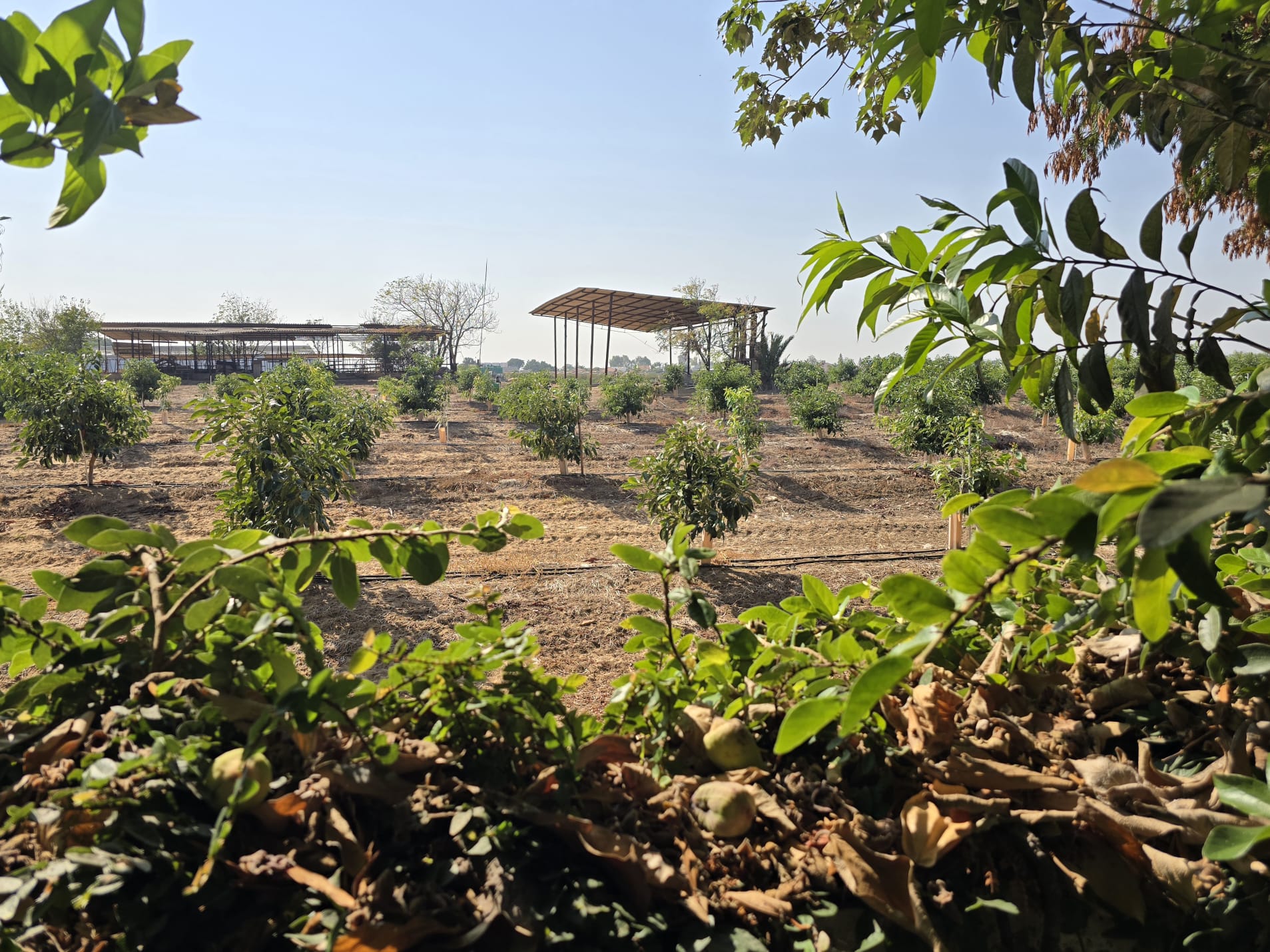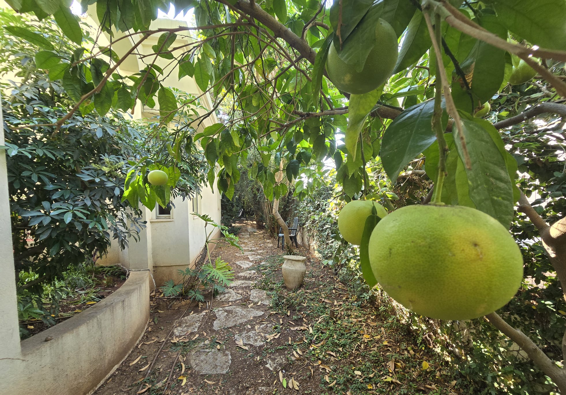 חצר אחורית רחבה ומטופחת הפונה לשטח חקלאי פתוח, עם פרטיות מלאה ונוף ירוק ורגוע.