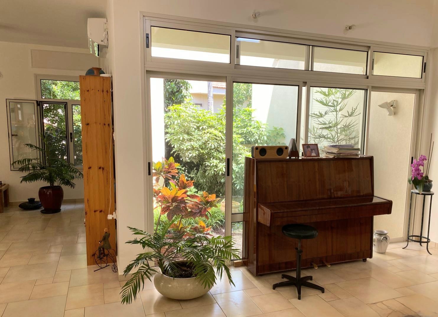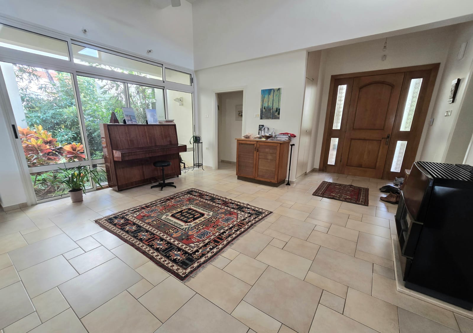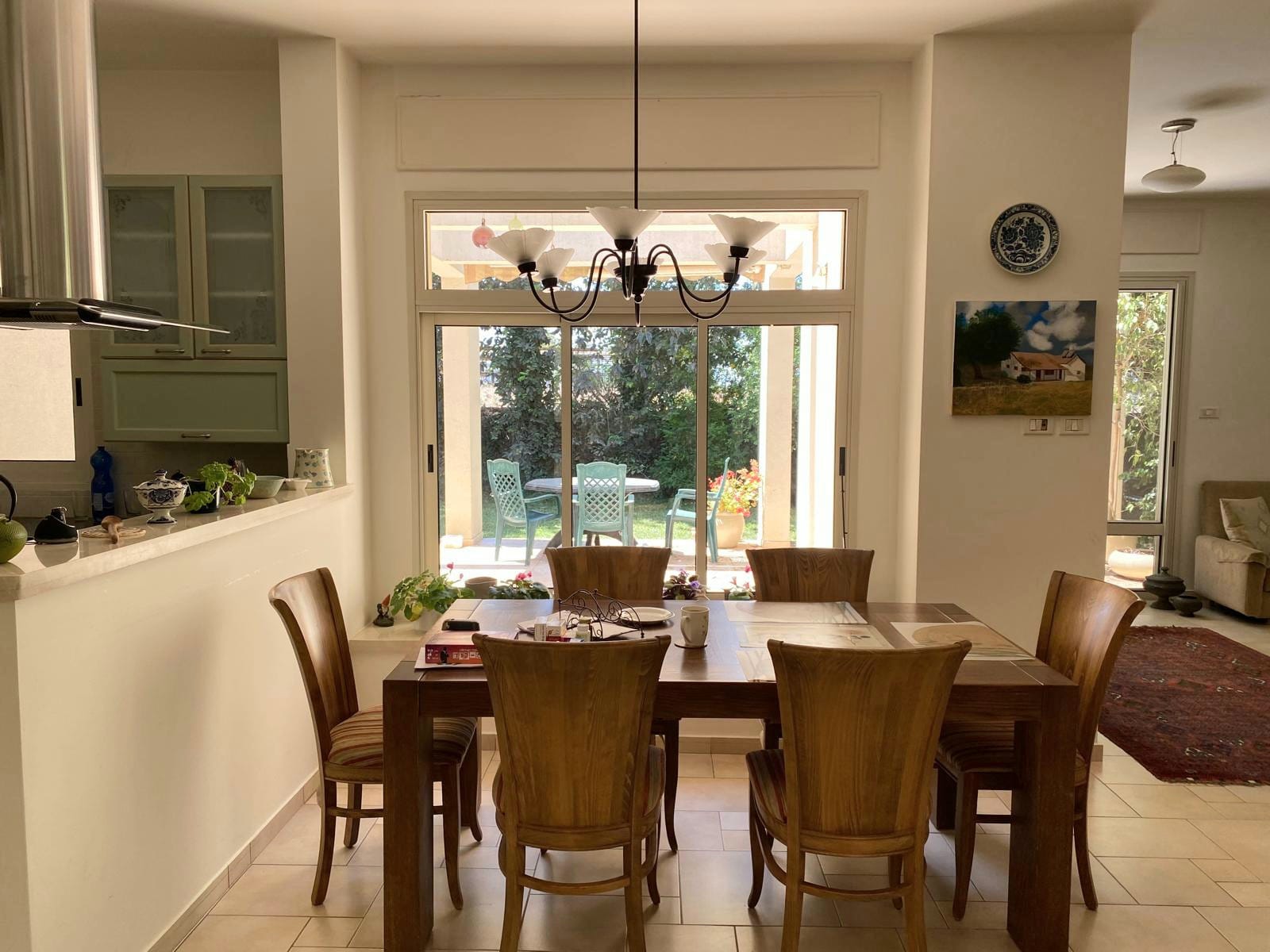חלל כניסה מרווח עם פטיו, סלון נעים עם יציאה לגינה ומקום לשולחן אוכל גדול.