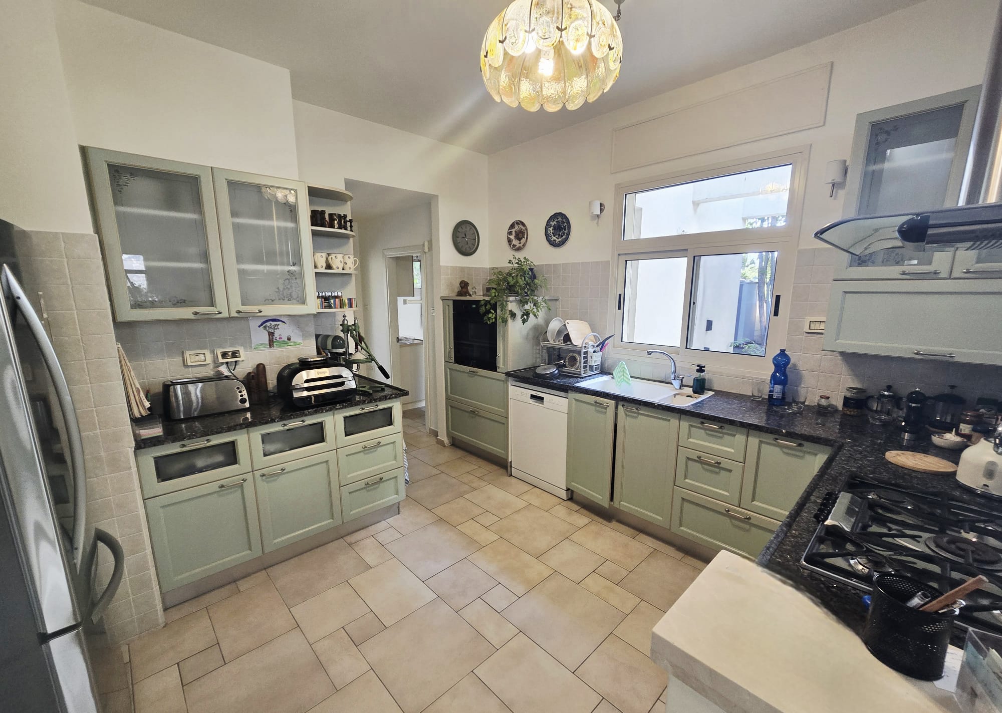 מטבח רחב עם שטחי אחסון רבים וגישה לחדר כביסה, שמוביל למחסן עם יציאה לחצר.